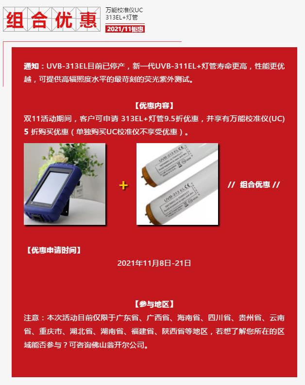 18566398802雙11活動期間,客戶可申請 313EL+燈管9.5折優(yōu)惠,并享有萬能校準(zhǔn)儀(UC) 5 折購買優(yōu)惠(單獨購買UC校準(zhǔn)儀不享受優(yōu)惠)。
