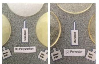圖3:聚氨酯(8)和聚酯(9)的結(jié)果如圖3所示。與環(huán)氧樹脂一樣,熒光紫外線測試的結(jié)果比氙氣測試的結(jié)果略微發(fā)黃,并且與現(xiàn)場失效情況最為接近。