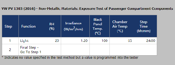PV1303非金屬材料汽車內(nèi)部空間里結(jié)構(gòu)件光照射試驗 中氙燈老化測試的循環(huán)參數(shù)設(shè)置如下: