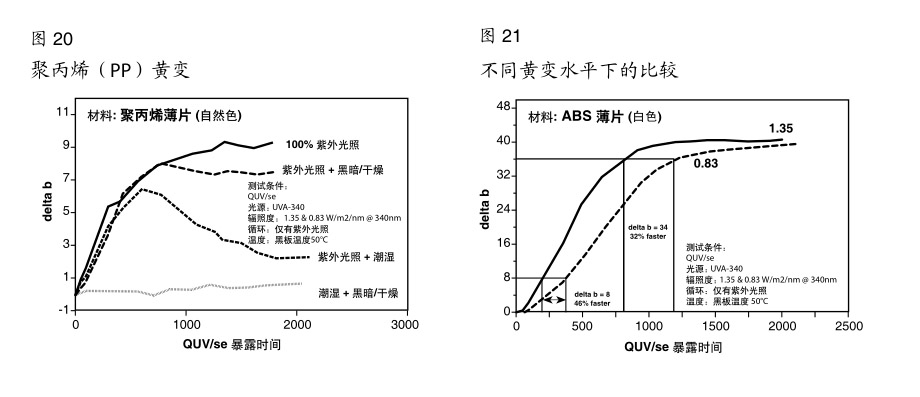 圖21顯示了以預(yù)期降解水平(在本例中,是發(fā)生黃變)進行暴露試驗會引起混淆。如果在delta b的值達到8后終止暴露,較高輻照度的暴露將會加快48%。如果在delta b的值達到34后終止暴露,較高輻照度將只加快32%。只有進行該試驗直到材料完全失效,才能完整地確定兩個暴露之間的關(guān)系。