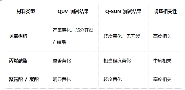 結(jié)果:環(huán)氧樹脂輕度黃化且無開裂,聚氨酯 / 聚酯黃化程度弱于 QUV