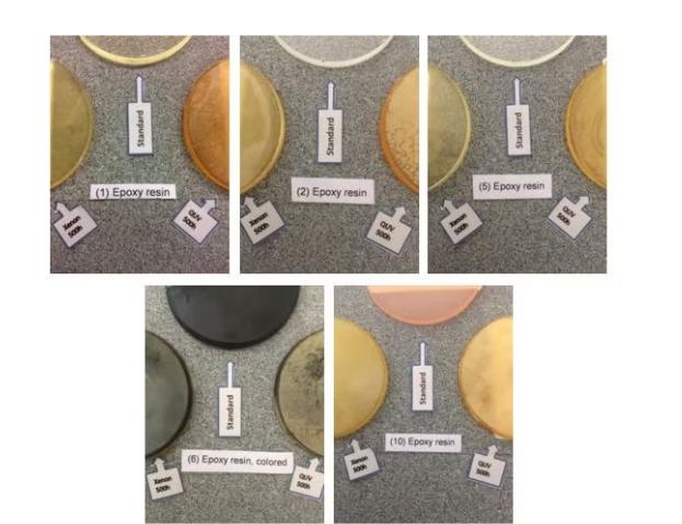 結(jié)果:500 小時后環(huán)氧樹脂出現(xiàn)嚴(yán)重黃化、部分開裂 / 結(jié)晶,聚氨酯 / 聚酯明顯黃化