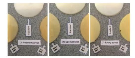圖2:丙烯酸酯的測試結(jié)果如圖2所示。聚甲基丙烯酸酯(3)和環(huán)氧丙烯酸酯(4)、(7)在紫外熒光和氙氣測試方法中表現(xiàn)出相當(dāng)?shù)睦匣S化結(jié)果。