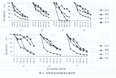 從以上數(shù)據(jù)可看到,不管是QUV加速老化試驗(yàn)還是戶外暴曬試驗(yàn),試樣的強(qiáng)力下降都很明顯。雖然這樣是很難比較兩者之間的相關(guān)性的,也很難對(duì)材料進(jìn)行篩選。但是這也可能是一種有效的產(chǎn)品研發(fā)試驗(yàn)。